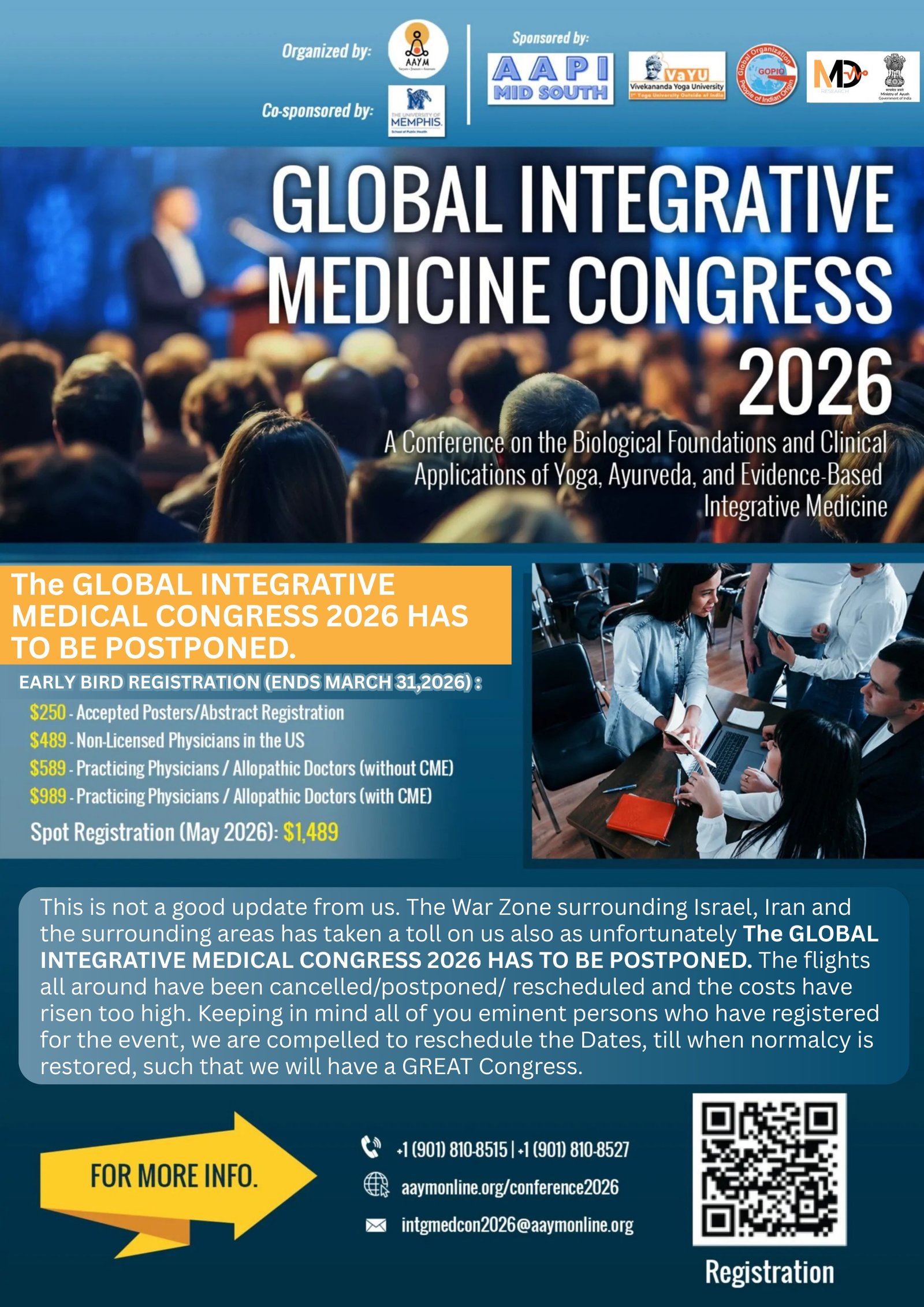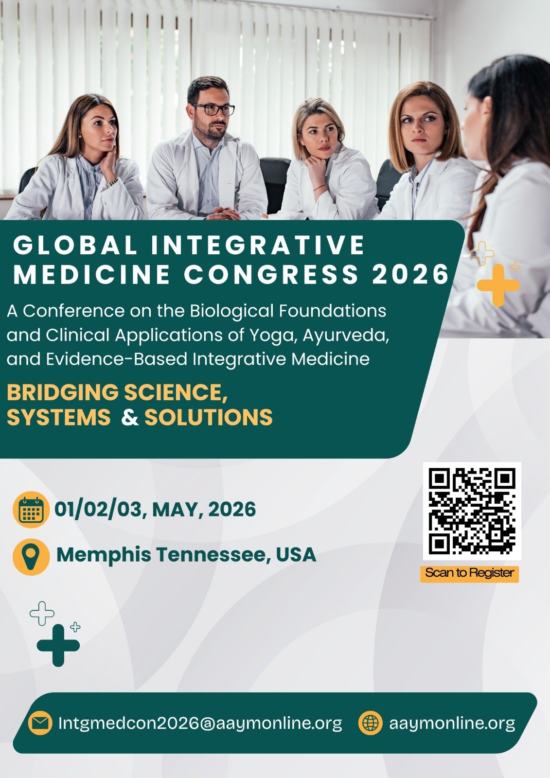 The American Academy for Yoga in Medicine (AAYM) will host an international conference in Memphis, Tennessee, focusing on Yoga, Ayurveda, and Integrative Therapies aimed at chronic diseases and rehabilitation.