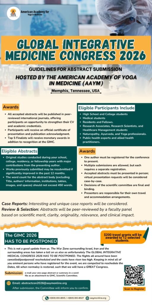 We invite high-quality research abstracts across all domains of integrative medicine, including Yoga, Ayurveda, clinical applications, diagnostics, rehabilitation, and emerging technologies. Share your research, innovation, or clinical experience with an international audience of medical professionals, scientists, and integrative health experts.