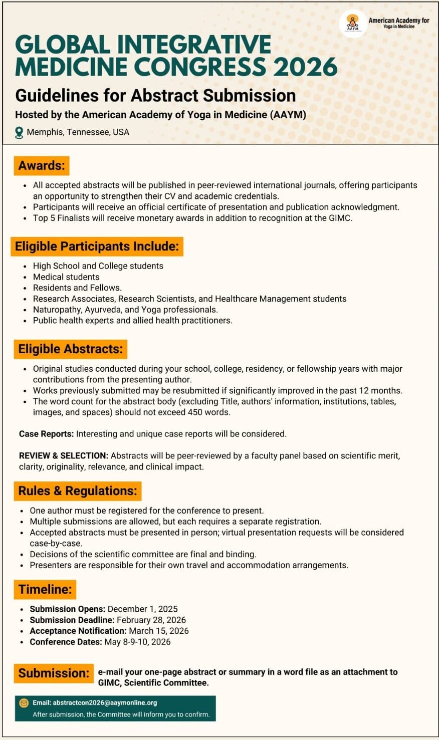 The American Academy for Yoga in Medicine (AAYM) will host a Conference on Yoga, Ayurveda & Integrative Therapies for Chronic Diseases & Public Health in Memphis, Tennessee, USA.